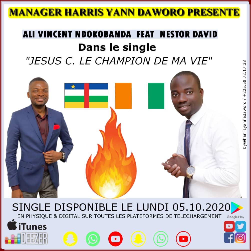 La musique centrafricaine renaît doucement, mais avec promptitude, à l'international. De vaillants jeunes, soucieux de promouvoir la culture centrafricaine, usent de leurs moyens et talents à cet effet. C'est le cas de Yann Haris Daworo, Manager de l'artiste gospel, Ali Vincent Junior Ndokobanda qui milite pour la valorisation du Sango, la langue nationale de Centrafrique. … Lire la suite Centrafrique – Musique: Le Chantre Ali V.J. Ndokobanda annonce la sortie de son single en featuring avec l’Ivoirien Nestor David